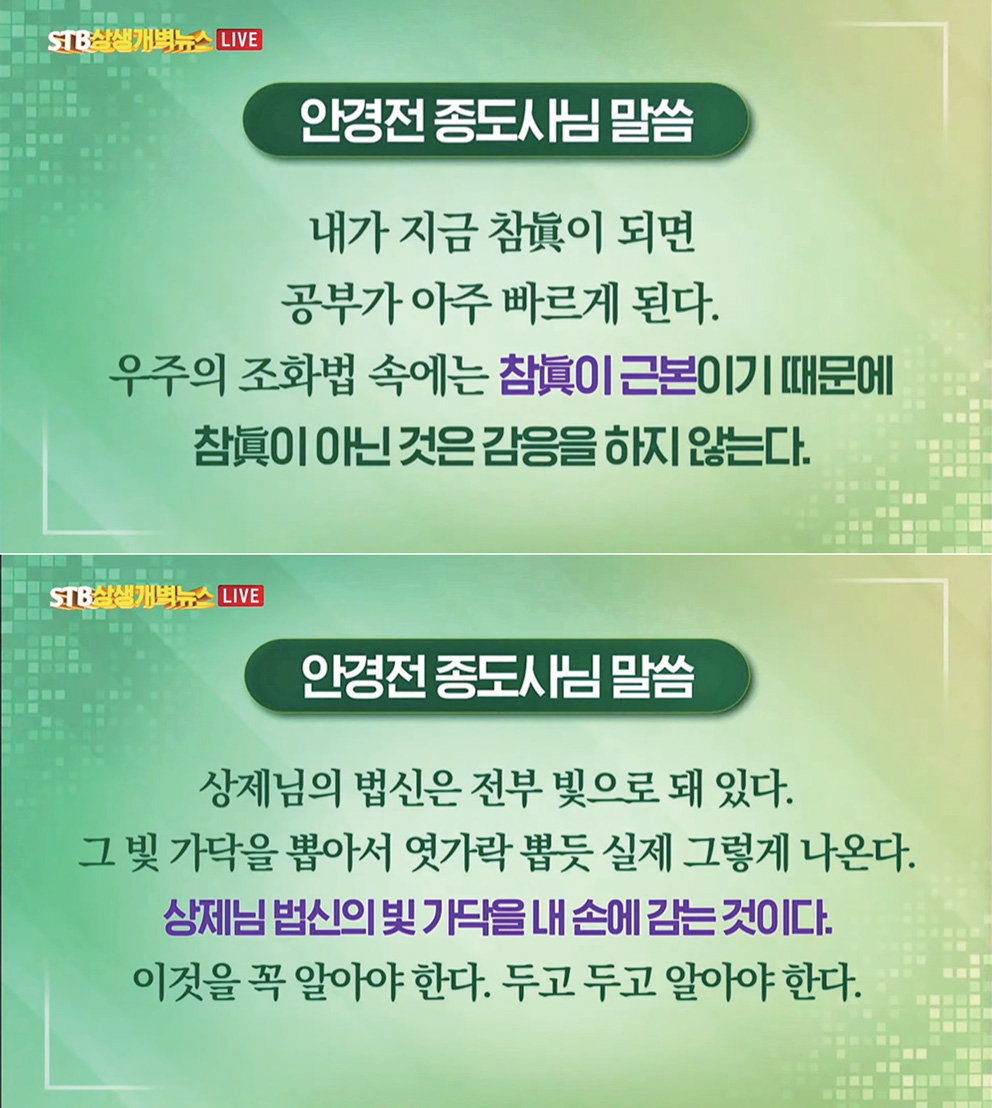 내가 지금 참[眞]이 되면 공부가 아주 빠르게 된다. 우주의 조화법 속에는 참[眞]이 근본이기 때문에 참[眞]이 아닌 것은 일체 감응을 하지 않는다.