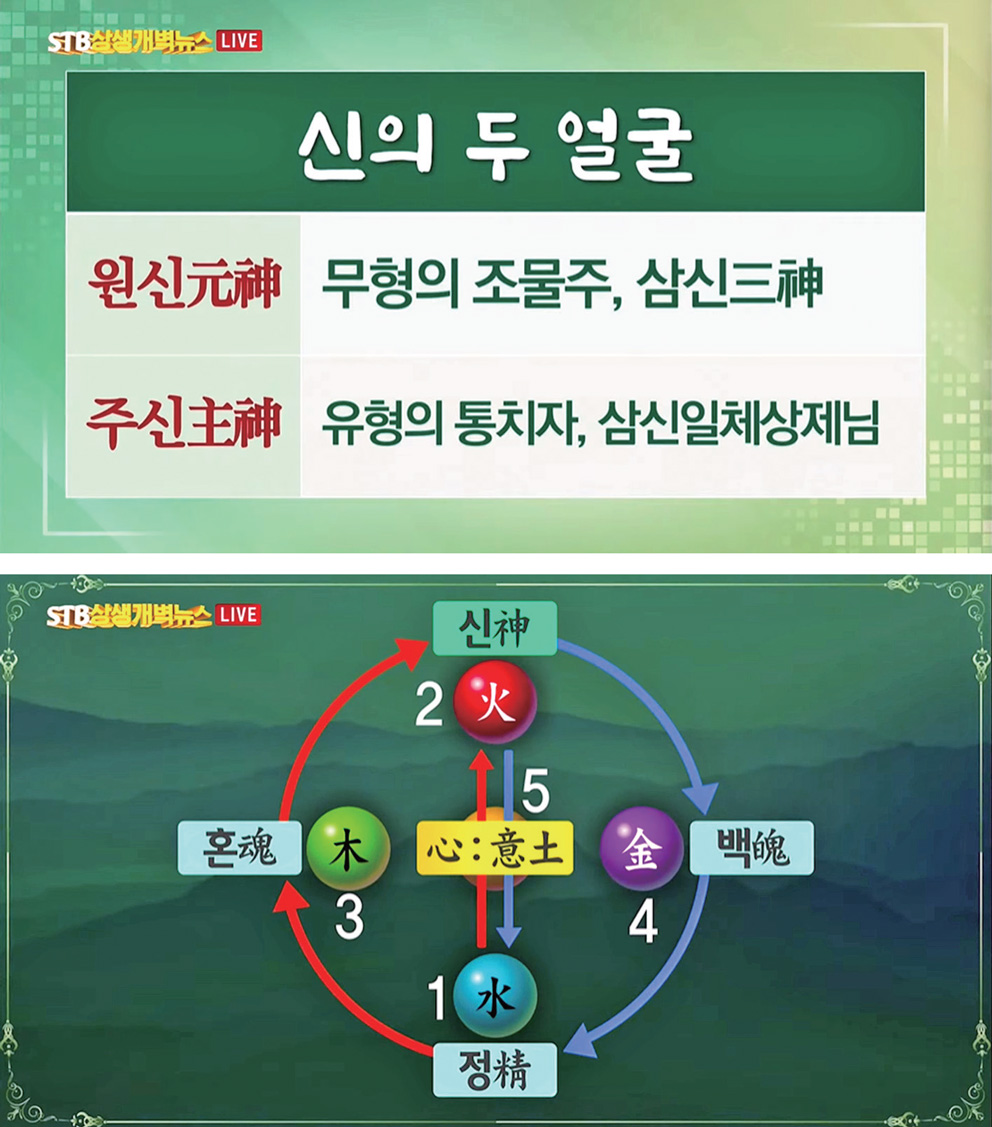 우주와 인간을 구성하는 다섯 가지 영적 요소를 ‘정신혼백의精神魂魄意’라고 합니다. ‘정신精神’은 우주의 인격신, 바로 우주의 주신主神이신 상제님이 주관하시고, ‘혼백魂魄’은 우주의 본체 삼신 무형의 조물주이신 바로 삼신 망량님들이 주관하십니다. 삼신 망량님들의 대표는 태허령님이시고, 우주의 근본 중심에는 인격신 아버지 삼신상제님이 계시는 것입니다. 그래서 우주의 정신에서 신줄을 받고 우주의 혼백에서 혼줄을 받은 것입니다.