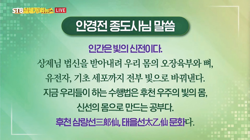 인간은 빛의 신전이다. 상제님 법신을 받아 내려 우리 몸의 오장육부와 뼈, 유전자, 기초 세포까지 전부 빛으로 바꿔 낸다. 지금 우리가 하는 수행법은 후천 우주의 빛의 몸, 조화신선造化神仙의 몸으로 만드는 공부다. 후천 삼랑선三郞仙, 태을선太乙仙 문화다.