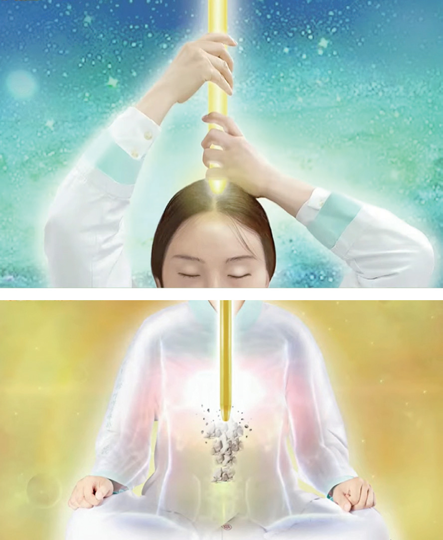이 조화 빛실은 여의주 자체이기 때문에 “제 머리에 채웁니다. 오장에 넣습니다. 팔다리에 채웁니다.”라고 생각하면 10초도 안 걸립니다. 광선여의봉 지름을 처음에는 두께 1센티미터 정도, 길이는 20센티미터 또는 30센티미터로 만든 후 “백회에다 넣고 충맥을 뚫습니다.” 하고 기도하며 주문을 읽습니다.