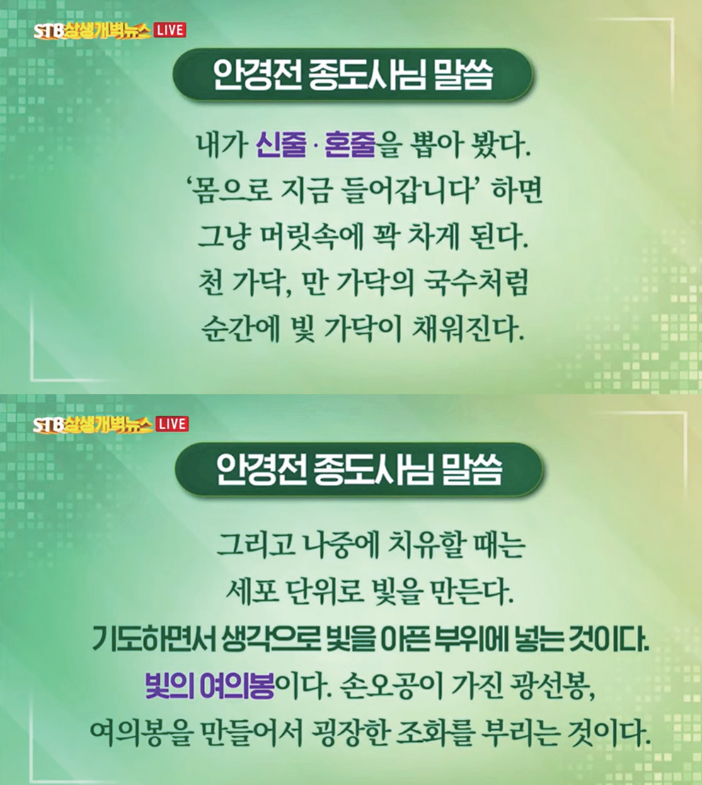 그런데 혼줄과 신줄, 두 선을 DNA처럼 꽈야 한다고 했는데 그럼 “그 광선은 어떻게 꼽니까? 광선이 보이지도 않는데 말이죠.”라고 질문할 수 있습니다. 혼줄과 신줄을 받을 때 영靈이 맑은 사람은 그걸 봅니다. 그런데 평소 몸이 탁하거나 수행을 거의 하지 않는 분들은 보이지 않는 경우가 있습니다.