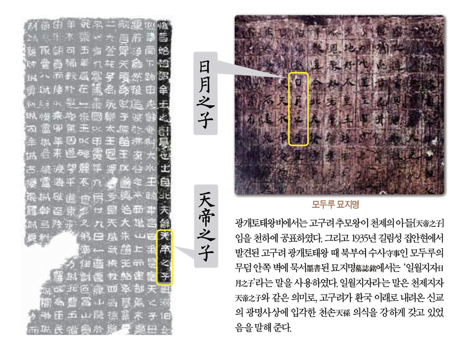 “옛적 (고구려) 시조이신 추모왕鄒牟王께서 나라를 세웠는데, 추모 성제는 북부여北夫餘 출신으로 천제의 아드님이고, 어머니는 하백河伯의 따님이시다.”(惟昔始祖鄒牟王之創基也 出自北夫餘 天帝之子 母河伯女郎)