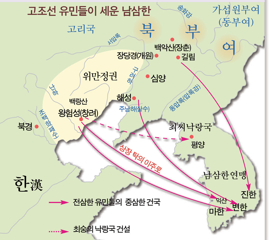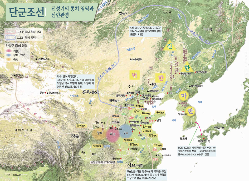 한민족의 뿌리 역사라 할 수 있는 단군조선은 ‘삼한관경제三韓管境制’를 적용하여 통치 영역을 진한辰韓⦁번한番韓⦁마한馬韓의 삼한으로 나누었다. 만주 대륙과 중원 그리고 한반도 일대를 비롯한 동아시아 전역을 통치하였다. 만주 대륙의 진한은 대단군이 직접 통치하고, 중원 지역의 번한과 한반도 영역의 마한에는 부단군을 두었으나 병권兵權만은 진한의 대단군이 행사했다. 대단군이나 부단군은 혈육이 이어 가거나 새로운 능력자가 차지하기도 했다.단군조선의 쇠락과 북부여의 흥기
