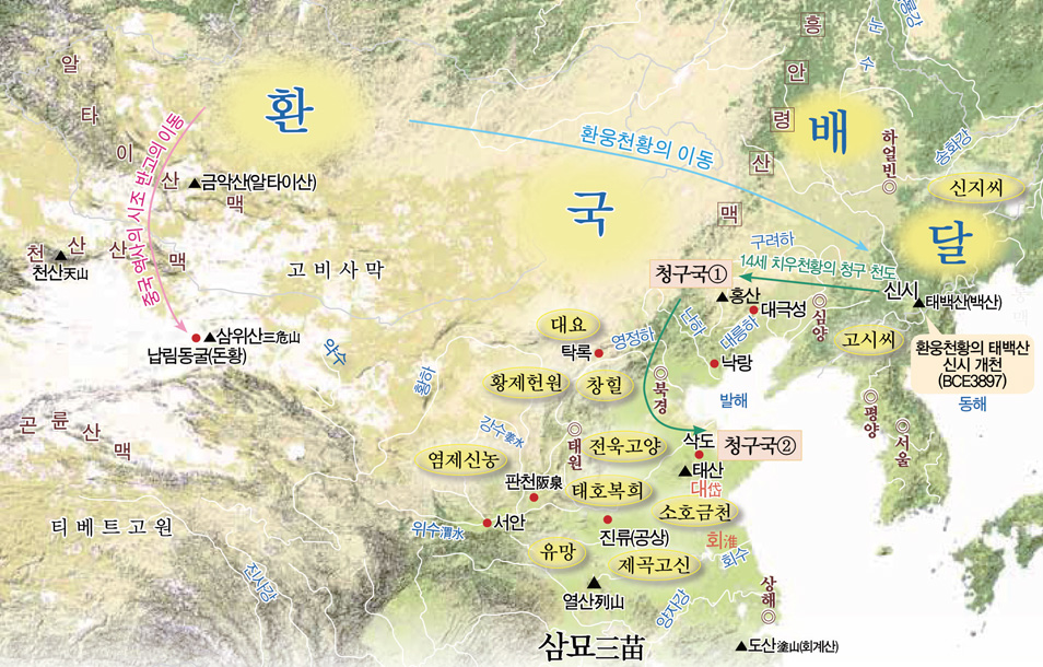 인근에 자리 잡은 배달국 사람들은 아침에 동산에 올라 태양을 경배하고, 밤에는 달을 맞이하는 광명光明의 사람들이었다. 이들이 터 잡은 백두산에 대해서 『삼한비기三韓祕記』에서는 이렇게 기록하고 있다.
