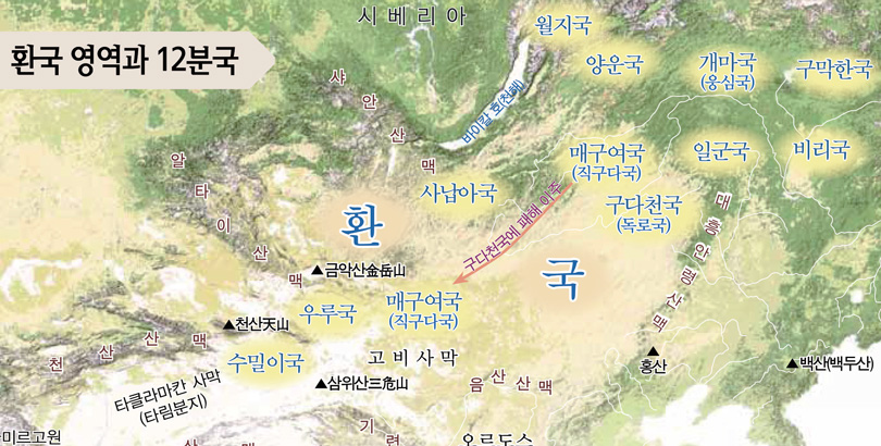 『환단고기』에 따르면 환국은 지금으로부터 9,200년 전에 건국됐다. 중앙아시아 동부, 천산天山을 중심으로 남북 5만 리, 동서 2만 리에 걸쳐 열두 나라로 구성되어 있었다. 또한 「삼성기三聖紀」 상上권과 하下권, 「태백일사太白逸史」의 〈환국본기桓國本紀〉에 의하면 중국 고대 문명은 물론 서양 문명의 근원이 되는 수메르 문명의 출원지가 바로 환국이기도 하다.