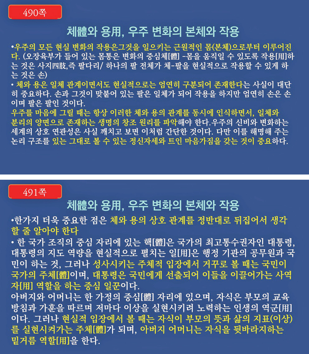 체와 용의 관계는 고정된 것이 아닙니다. 우주의 진리는 음양이기에 어디에 기준을 두느냐에 따라 체와 용이 달리 보일 수 있습니다. 예를 들어 국가 조직에서 중심 자리에 있는 ‘핵’, 곧 ‘체’는 대통령일 수 있습니다. 그러나 그 지도 역량을 현실에서 펼쳐 작용하는 것은 공무원과 국민입니다. 또 일을 성사시키는 현실적⦁주체적 입장에서 보면 국민이 국가의 주체가 되고, 대통령은 국민에게 선출되어 이들을 이끌어가는 사역자, 중심 일꾼의 역할을 합니다.