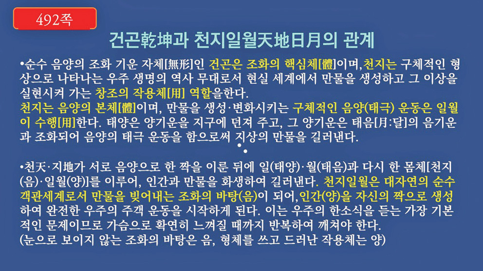 건곤乾坤과 천지天地⦁일월日月은 조금 어려운 내용이지만, 본문을 따라 정리해 보겠습니다. 순수 음양의 조화 기운 자체—형체가 없는 무형의 ‘천지의 정신’—이 곧 ‘건곤’입니다. 건곤은 조화의 핵심체이고, ‘천지’는 구체적 형상을 갖춘 우주의 생명, 역사 무대로서 현실 세계에서 만물을 생성하고 이상을 실현시켜 가는 ‘창조의 작용체’ 역할을 합니다. 다시 말해, 건곤은 핵심체이고 천지는 그 건곤의 정신을 받아 실제 역사 무대에서 만물을 생성시켜 나가는 작용체입니다.