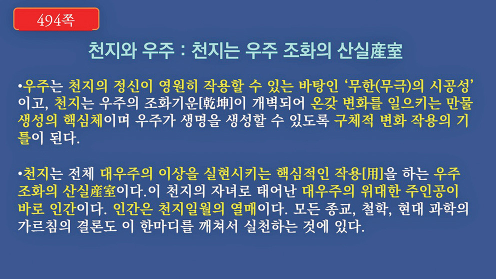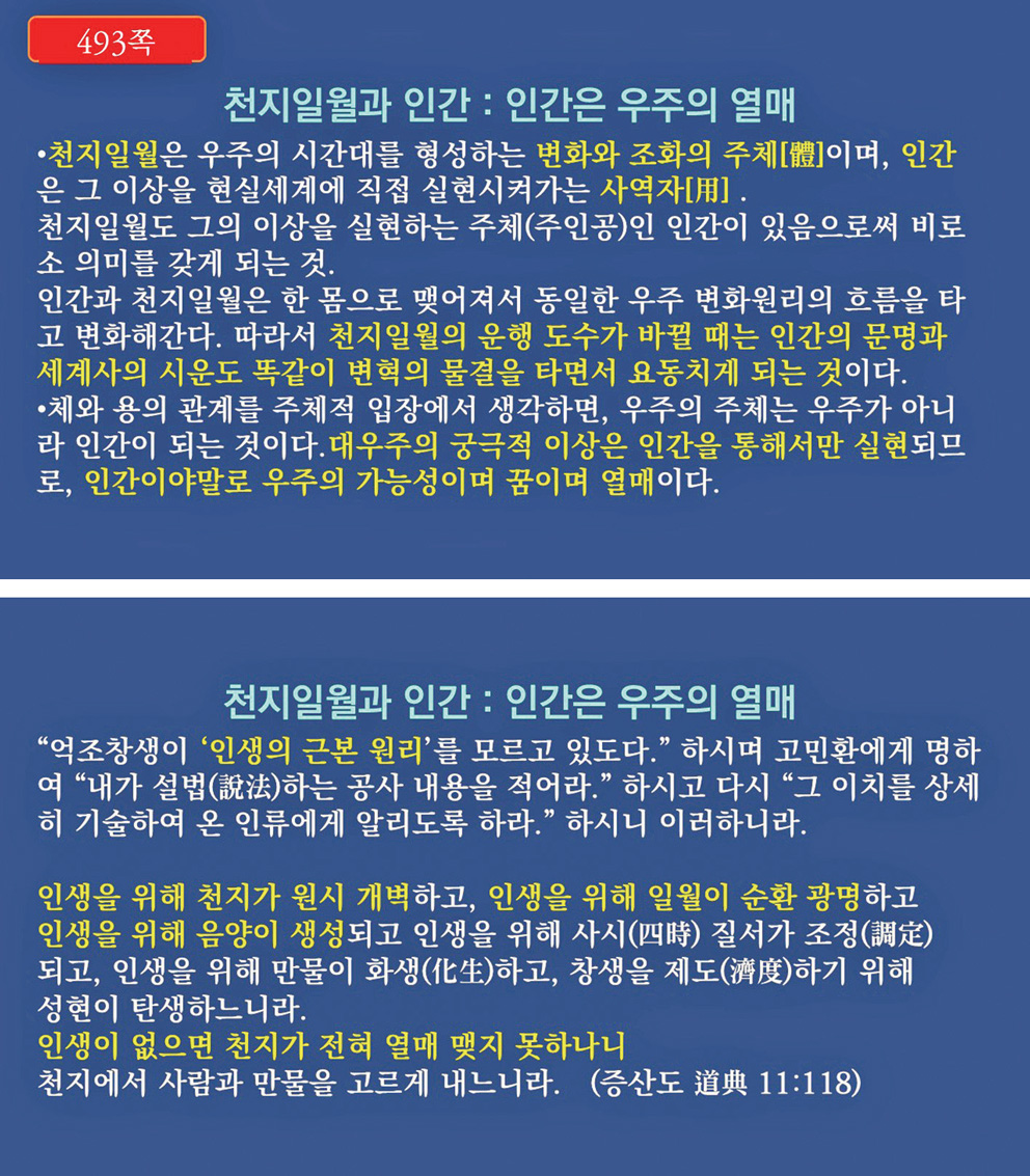 결론적으로, 대우주의 궁극적 이상은 인간을 통해서만 실현되므로 인간이 우주의 열매입니다. 태모님께서도 『도전道典』 11편 118장에서 분명히 밝혀 주셨습니다. ‘인생의 근본 원리’에 대한 말씀입니다.
