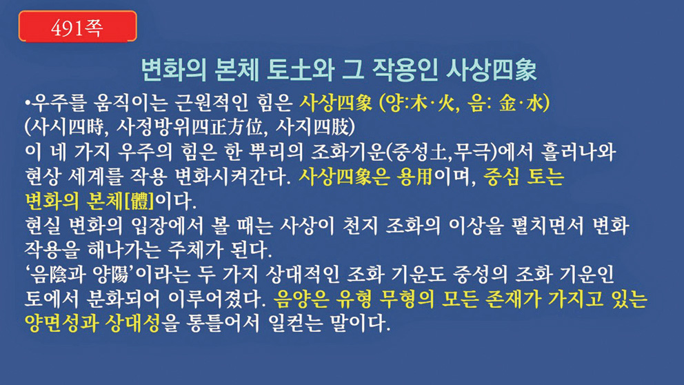 491쪽에서는 이제 본격적으로 우주 변화 원리를 살펴봅니다. 실질적으로 이 우주를 변화시켜 나가는 절대 원리가 ‘오행五行’인데, 오행은 변화의 본체인 ‘토土’와 그 작용인 ‘사상四象’으로 이루어져 있습니다.
