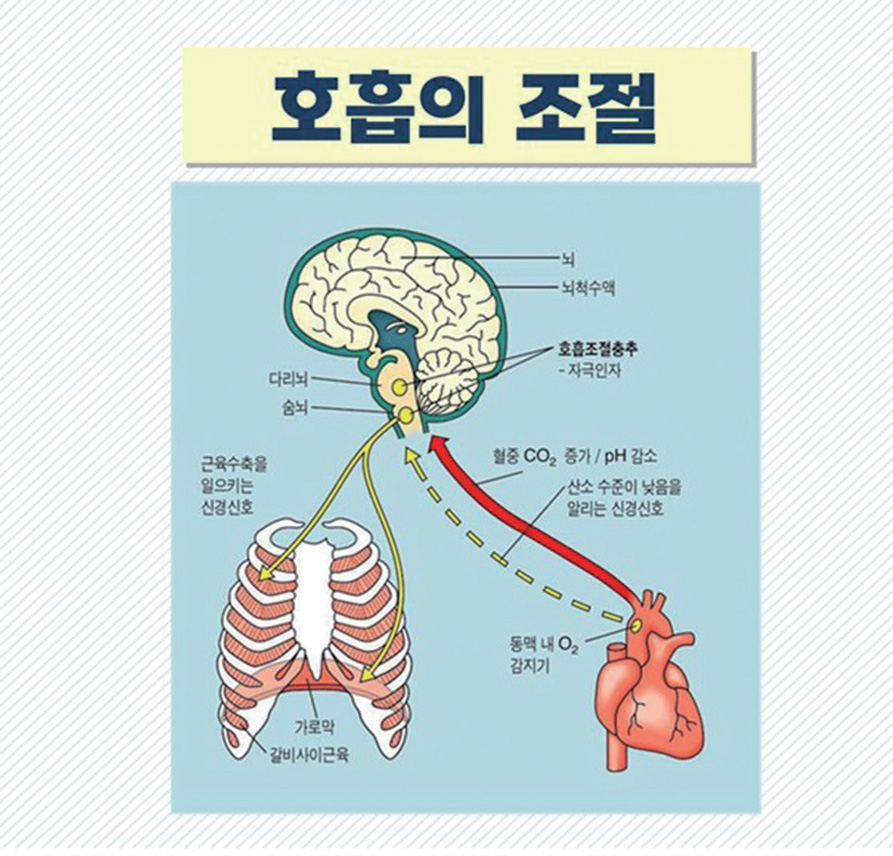 심장은 스스로의 전기 신호와 자율신경계의 신호를 받기 때문에 운동이나 심리 상태에 따라 심장의 운동이 달라질 뿐 우리의 의지로 심장박동을 조절하기는 힘듭니다. 그런데 심장과 폐는 밀접하게 연결되어 동시에 활동하고 있고요, 폐의 운동, 즉 호흡은 우리의 의지로 통제할 수 있기 때문에 우리는 호흡 운동을 조절함으로써 심장의 박동도 간접적으로 조절할 수 있는 것이죠. 실제로 호흡을 빨리하게 되면 점차 심장도 빨리 뛰고, 호흡을 느리게 하면 심장도 느리게 뛰는 것을 느낄 수 있습니다.