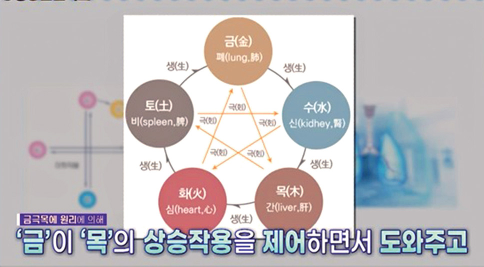 근데 퍼뜨리는 것은 목이나 화의 성질인데 금의 장부인 폐가 선발 작용을 하는 것은 어떤 원리일까요? 그것은 금金과 목木의 대화작용 때문인데요. 금과 목은 오행의 방위에서 서로 반대편에 위치하여 금은 금극목金克木의 원리에 의해 목의 상승 작용을 제어하면서 도와주고, 동시에 목도 금에 영향을 미쳐 금의 성질이 너무 딱딱해지지 않도록 도와주는 역할을 하고 있습니다. 폐는 금의 장부이지만 실제 폐는 스펀지처럼 말랑말랑하죠. 폐가 딱딱해지는 것을 폐 섬유화라고 하는데 폐 섬유증肺纖維症은 발병하여 진행되면 5년 생존율이 40% 미만으로 위험한 질환이라고 합니다.