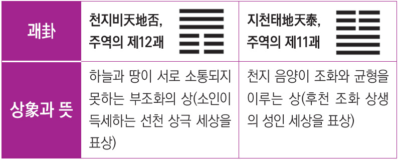 그러나 후천은 어머니 땅이 위에서 아래로, 아버지 하늘이 아래에서 위로 향하니까 음양일체陰陽一體가 됩니다. 리하르트 빌헬름Richard Wilhelm(1873~1930)은 이것을 ‘평화의 괘’라 정명正名했습니다. 평화와 자유, 행복, 진정한 생명의 질서라는 것은 어머니 땅이 중심이 되어 이루어지는 것입니다.