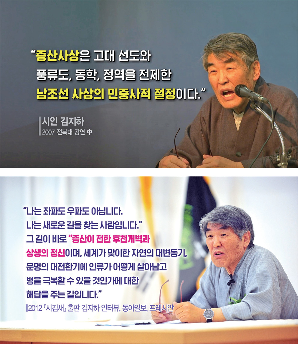 시인 김지하金芝河(1941~2022)의 전집을 보면 “전 세계 사상사, 종교사를 정리해 보면 인류 문화의 최종 결정판은 강증산의 남조선 사상이다. 그것은 민중사적인 절정이다.”라는 말이 있습니다. 증산 사상은 옛날에 신도, 풍류도라 한 우리의 전통 신교와 동학과 정역을 바탕에 깔고 있다는 것입니다.