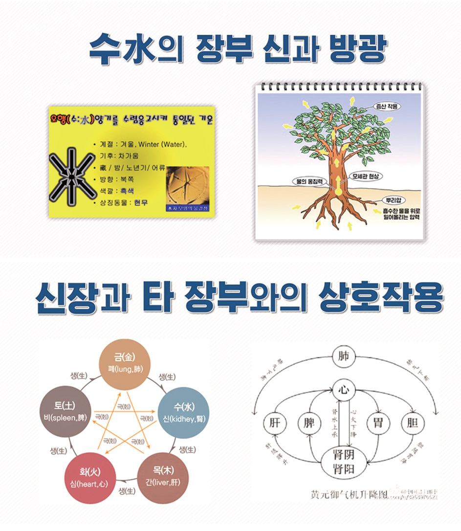신장은 짝이 되는 방광膀胱과 함께 오행에서 수水에 해당하는 장부입니다. 수는 목木⋅화火⋅토土⋅금金⋅수水의 오행 변화에서 근본이 되는 에너지로 작용합니다. 한동석韓東錫 선생은 『우주 변화의 원리』에서 오행은 수水가 변화하는 단계적인 소변화일 뿐 사실상 변화의 본체는 수水라고 하였죠. 따라서 신장은 마치 나무의 뿌리처럼 간肝ㆍ심心ㆍ비脾ㆍ폐肺와 상호 작용하면서 오장육부 대사의 바탕적인 역할을 하고 있습니다.