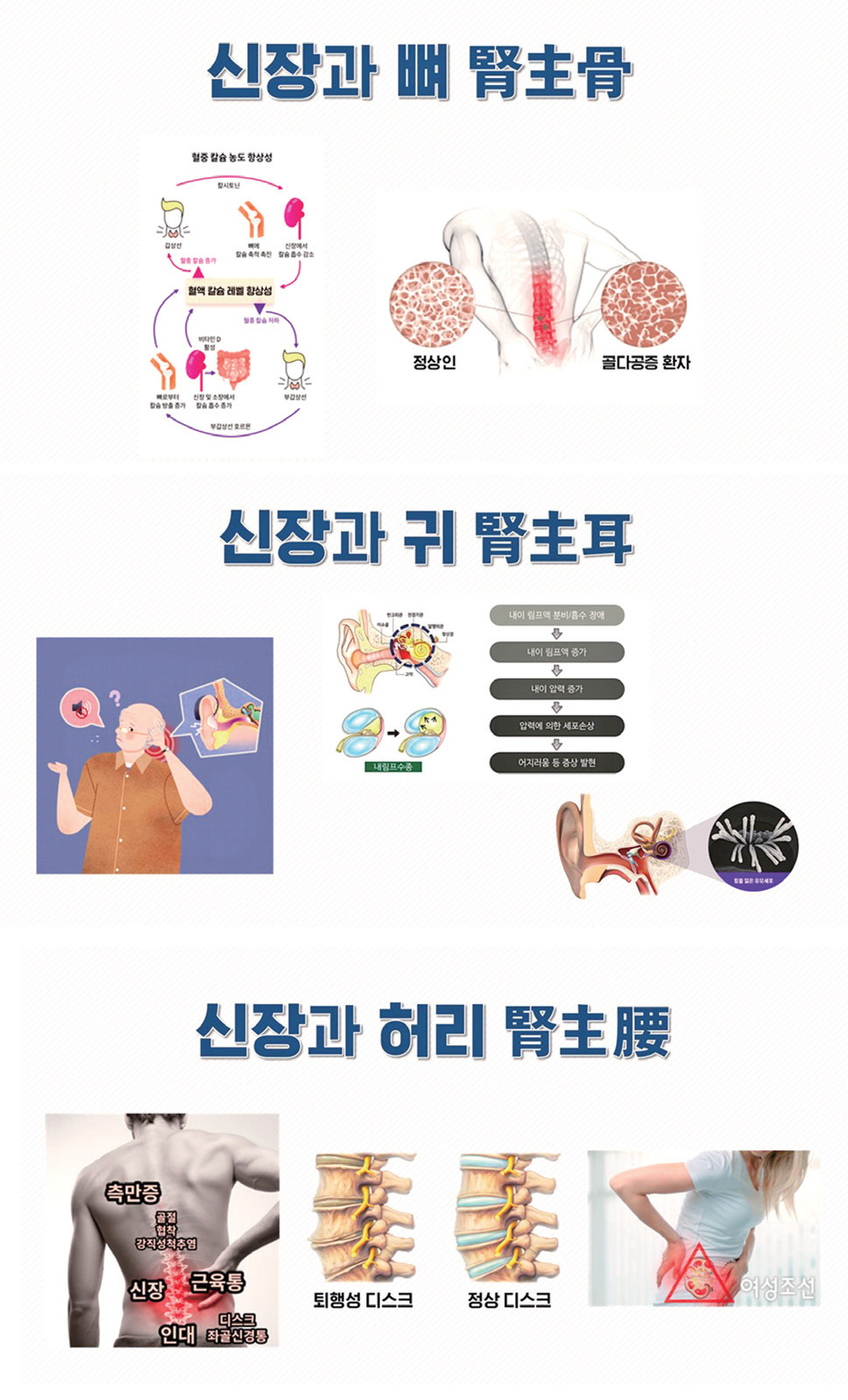 신장 기운이 약한 분들 중에는 만성적인 요통을 호소하는 분들이 많습니다. 신장이 위치한 곳이 허리 부위이기에 신우신염腎盂腎炎처럼 신장 자체에 염증이 생겼을 때 허리에 심한 통증이 나타나는 경우가 많습니다. 또한 한의학적으로 신장은 뼈와 골수를 주관하기 때문에 신장의 기운이 약해지면 척추 관절 사이에서 충격을 흡수해 주는 척추 디스크가 마르고 딱딱해지며, 주변의 인대와 근육의 탄력도가 떨어지게 되면 허리 통증이 쉽게 발생합니다.