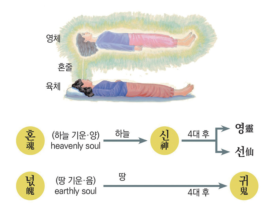 김송환金松煥이 사후死後의 일을 여쭈니 말씀하시기를 “사람에게는 혼魂과 넋[魄]이 있어 혼은 하늘에 올라가 신神이 되어 제사를 받다가 4대가 지나면 영靈도 되고 혹 선仙도 되며 넋은 땅으로 돌아가 4대가 지나면 귀鬼가 되느니라.” 하시니라. (도전道典 2:118:1~4)