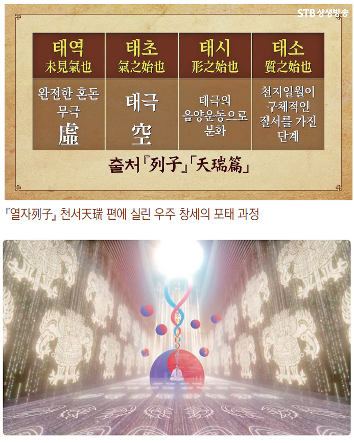 『열자列子』에 보면 우주 창세의 포태 과정을 태역太易, 태초太初, 태시太始, 태소太素라 했다. 태역은 무극無極, 태초는 우주의 생명이 통일되어서 우주 질서가 농축되어 있는 공태극空太極, 태시는 수태극水太極 단계로 우주의 물이 생성되는 때라고 말한다. 그리고 천지일월이 구체적인 형상 질서를 가져서 우리가 살고 있는 지금의 우주가 된 것이 태소, 곧 황극皇極이다.