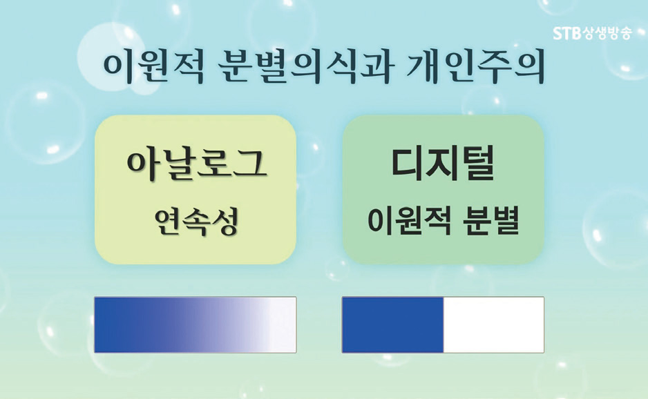 아날로그는 쭉 이어져 있어서 연속적인데, 디지털은 A 아니면 not A, 이것 아니면 이것이 아닌 것, 이렇게 둘로 나뉘게 됩니다. 그래서 무엇을 접할 때 항상 세계를 크게 둘로 나눠서 보게 되는 거예요. 선이냐 악이냐, 좋은 것이냐 싫은 것이냐, 1이냐 0이냐, 이게 디지털 방식이잖아요. 이기는 거냐 지는 거냐, 이렇게 둘로 나눠서 보는 방식이 바로 디지털적인 사유 방식이다, 이렇게 말할 수 있겠죠.