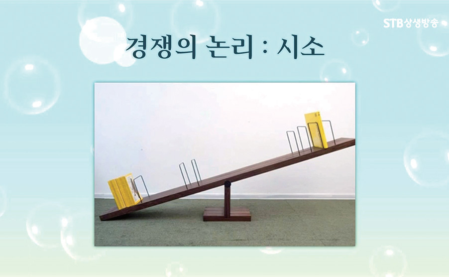 이 장벽은 나와 너를 갈라놓고, 둘을 서로 대립하는 경쟁자로 만들게 하는 기준이 됩니다. 그렇게 되면 나와 남의 관계는 결국 시소 같은 관계가 되죠. 내가 이기면 남이 져야 하고, 내가 얻으려면 남이 잃어야 하고, 반대로 남이 얻으면 나는 잃는 관계가 되는 겁니다. 나와 남의 관계를 항상 이런 시소의 관계, 경쟁자의 관계로만 보게 되는 거죠.