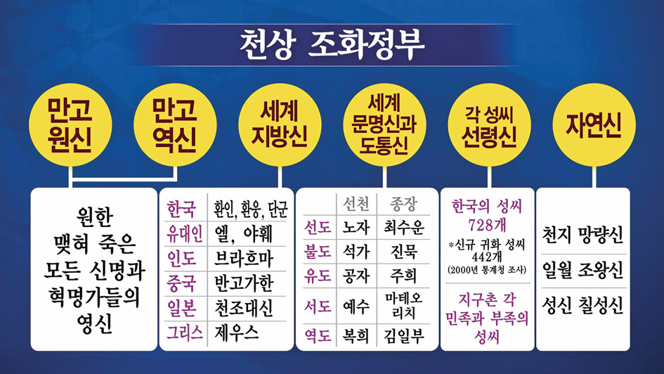 조화정부에는 천지를 다스리는 병권의 최고 주권자 박공우 만국대장님이 있고, 대학교 총장 김경학 성도님이 있습니다. 신선 문명의 근원은 김형렬 성도님이고, 선매숭자仙媒崇子를 받아야 산다고 말씀하신 여자 어린이 김호연 성도와 남자 어린이 백복남 성도도 지금 조화정부에서 역사하고 있습니다. 어린이 여자, 어린이 남자는 간소남艮少男 태소녀兌少女인데 이런 어린이 문화는 이 우주에서 증산도 『도전』에서만 찾아볼 수 있습니다. 그것이 간태합덕艮兌合德 도수인데 이걸 누가 알아요? 『주역周易』을 백천만 번을 봐도 이 간소남 태소녀가 무엇인지 정확히 알 수 없는 것입니다.