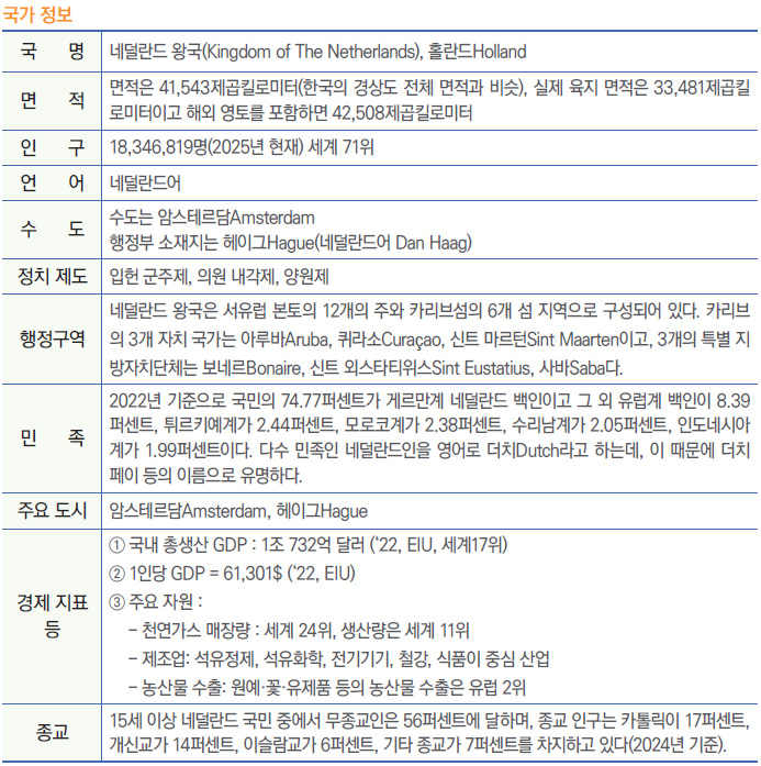 네덜란드는 1949년 대한민국 정부를 승인했고 1961년 공식 수교 이후에는 기술⋅투자⋅반도체⋅문화 교류에 이르기까지 매우 우호적인 관계를 유지하고 있는 나라다. 정식 명칭은 네덜란드 왕국(Kingdom of The Netherlands)인 이 나라는 모두 네 개의 나라로 구성되어 있다.
