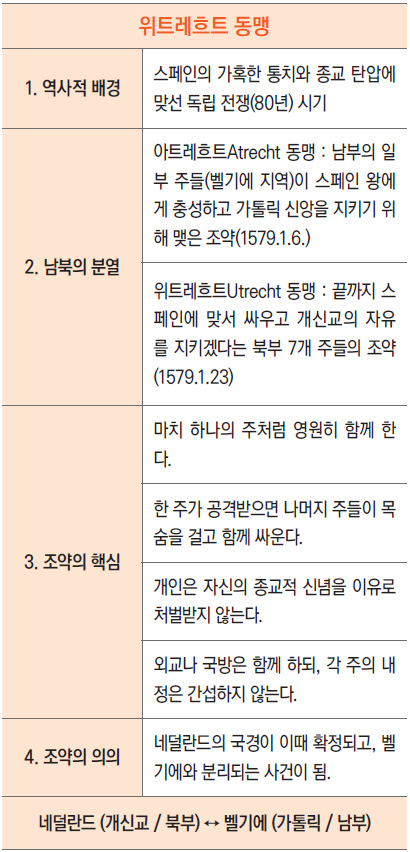 로마 쇠퇴 후 이 지역은 프랑크 왕국 등 게르만 세력에 편입되었고, 이후 여러 봉건 영지와 도시국가가 발달했다. 16세기 스페인 합스부르크 통치에 맞선 80년 전쟁(1568~1648)에서 북부의 7개 주가 동맹(1579년, 위트레흐트Utrecht 동맹)을 선언한다. 끝까지 스페인에 맞서 싸우고 개신교의 자유를 지키겠다고 나선 이 동맹은 네덜란드라는 국가의 탄생을 알리는 건국 선언문이자 최초의 헌법과도 같은 역사적 조약이다. 반면 남부의 주들은 아트레흐트Atrecht(아라스Arras) 동맹을 맺고 스페인과 타협하여 가톨릭을 유지하고 스페인 왕에게 충성하기로 한다. 이 지역은 오늘날 벨기에의 기반이 된다.