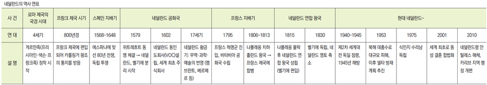 네덜란드는 중심이 되는 중앙 국가 또는 특정 거점이 주변을 병합하면서 성장했던 다른 국가의 역사와는 다르다. 오히려 특정 지역의 처지와 정서가 비슷한 도시들이 따로 살았다가 외부의 위협에 직면하자 도시들끼리 뭉쳐서 국가를 만든 것에 가깝다. 네덜란드 역사는 로마 제국의 국경 지대에서 시작해, 16세기 독립 투쟁과 17세기 황금기를 거쳐 오늘날의 입헌군주국으로 발전했다고 크게 정리해 볼 수 있다.