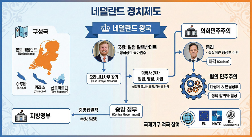 네덜란드는 의회 민주주의에 기초한 입헌 군주국이다. 현재의 왕가는 오라녜나사우 왕가(Huis Oranje-Nassau)로 빌럼 알렉산더르Willem-Alexander 국왕이 2013년 이래 재임하고 있다. 명목상 입법권, 행정권, 사법권이 국왕에게 속하기 때문에 통치자의 권한을 행사할 수 있다. 다른 입헌 군주제 국가에 비하면 왕권이 넓은 편이다. 국방 관련 권한은 정부에 속한다. 그러나 국왕은 국가 원수로서의 의례에 관여할 뿐, 내각을 이끄는 총리가 실질적인 행정부 수반이다.
