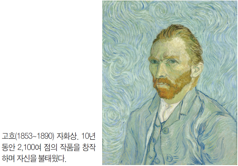 네덜란드 후기 인상주의 화가 빈센트 반 고흐Vincent van Gogh(1853~1890)는 한국에서 해바라기 그림으로 특히 사랑받는 화가다. 불과 10년간 2,100여 점의 작품을 창작했으며, 대담한 색채와 극적 붓놀림이 특징이다. 동생 테오Theo의 재정 지원을 받으며 작품 활동을 했다. 정신적 불안정과 건강 문제로 고통받았으며, 친구 폴 고갱Paul Gauguin과의 대치 후 자신의 귀를 자르는 사건도 있었다. 정신병원에서 많은 시간을 보냈고, 1890년 37세에 자살로 생을 마감했다.