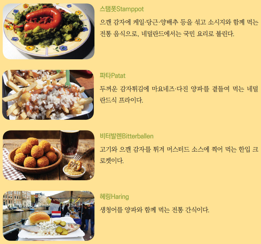 네덜란드에서 주요 음식으로 꼽히는 것은 스탬폿, 파타, 비터발렌, 헤링 등을 들 수 있다.