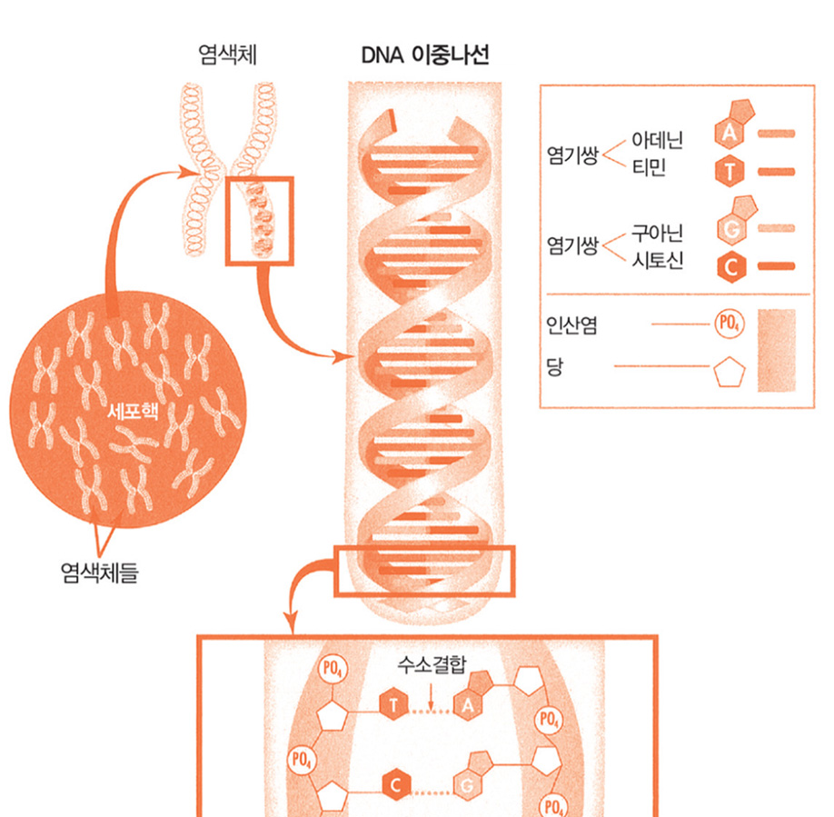 염색체는 1에서 22까지 번호가 매겨진 염색체와 성염색체인 X와 Y 염색체가 있다. …… 부모가 자녀에게 각각 염색체 23개, 30억 개의 염기가 들어 있는 DNA를 물려주므로, 자녀의 세포는 총 46개의 염색체, 60억 개의 염기를 갖는다. (40쪽)
