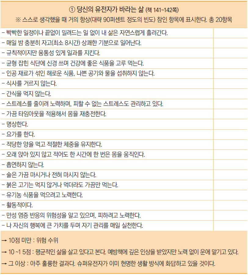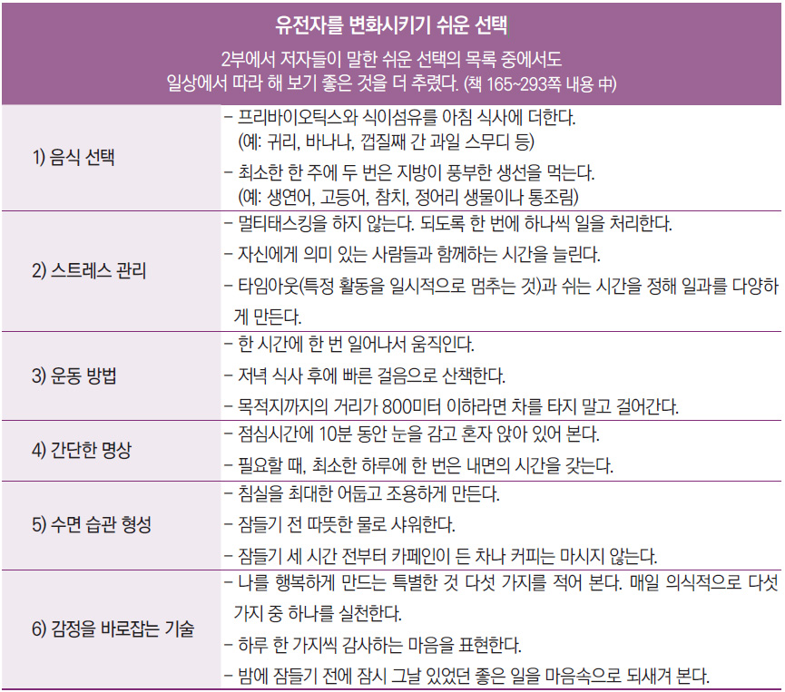 도입부에서 말했다시피 이 책의 저자들은 정면으로 그러한 통념에 반박한다. 그들은 후성유전학後成遺傳學(epigenetics)적 연구 결과를 토대로 생활 환경의 변화에 따른 유전자의 가변성可變性을 제시한다. 그들의 주장은 생활 방식의 변화를 통해 타고난 유전적 감수성을 얼마든지 초월할 수 있고, 이를 통해 인간은 얼마든지 유전자의 활성 방식에 긍정적인 변화를 줄 수 있다는 것이다. 유전자가 일방적으로 우리의 건강과 행동을 통제하고 지배한다는 과거의 인식을 깨면서, 오히려 유전자를 우리의 선택과 행동에 실시간으로 영향을 받으며 환경과 상호 작용하는 존재로 재정의한다.