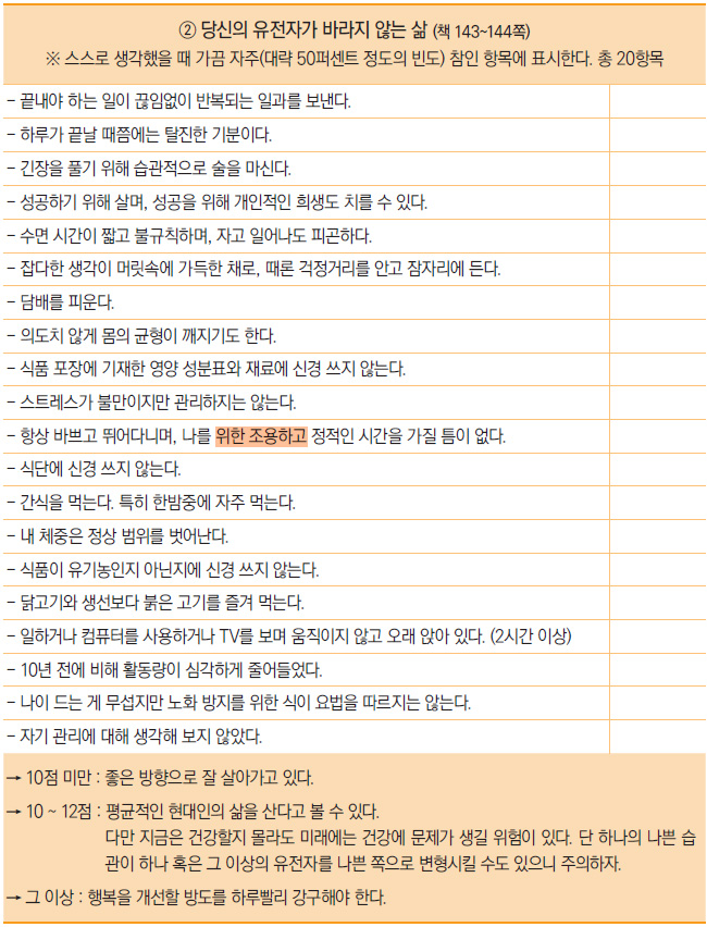 천 리 길도 한 걸음부터라고, 책에서는 생활 방식을 소개하기에 앞서 독자들에게 두 가지 체크리스트를 보여 준다. 평가 기준은 미국인을 기준으로 한 것이기는 하나, 여러분도 참고삼아 체크해 보기 바란다.