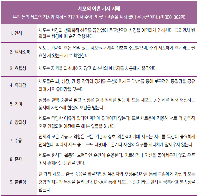 이 책에서 추천하는 모든 생활 방식의 선택은 하나의 메시지로 귀결된다. 바로 몸의 지혜를 회복하고 그것을 따르자는 것이다. 인간은 종종 자신에게 해가 될 나쁜 선택을 하지만, 우리 몸의 세포는 자신에게 해로울 그 어떤 행위도 하지 않는다. 우리는 무의식중에 뇌만이 자아와 주변 환경을 인식한다고 믿었지만, 사실 뇌세포뿐만 아니라 모든 세포가 수억 년 동안 지식을 축적해 왔다. 이 책에서 말하는 세포의 지성과 지혜는 지구에서 최초의 단세포 생물이 생겨났을 무렵부터 생존을 위해 쌓아 온 능력이다. 매 순간 환경에 적응하고 반응하면서, 자신은 물론 다른 세포⋅조직⋅장기를 위한 올바른 선택을 하는 바로 그 세포의 지혜와 우리 인간은 협력해야만 한다.